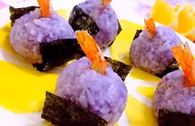 3、將小球紫薯泥放在一張保鮮膜上,按扁,包入小飯球,然後抓起保鮮膜的四周,擰成一團,然後再剝去保鮮膜,紫薯飯糰就做好了;