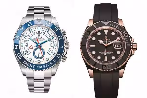Yacht –MasterII,2013(左)Yacht –Master,2015,新款Oysterflex錶帶,採用高性能黑色橡膠包裹金屬片,是錶帶更加堅固、耐用(右)。
