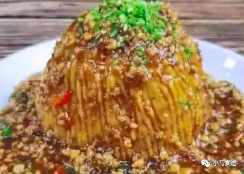 1.土豆去皮洗凈,上籠大火蒸熟,碾成泥,裝盤,做成火山形狀。