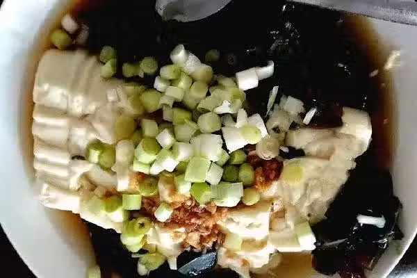 1. 內酯豆腐放冰箱冰一下導出來是整個的,蒜,姜適量搗碎,加入味極鮮,陳醋,香油調成湯汁,皮蛋切碎放在豆腐上面,澆上調好的湯汁,撒上蔥花