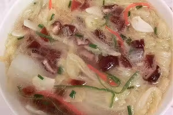 2. 燒開水娃娃菜入鍋汆燙好後撈出瀝干水分,鍋洗凈熱油鍋爆香蒜末薑末,倒入適量清水,放入皮蛋、香菇、青紅椒絲煮沸。