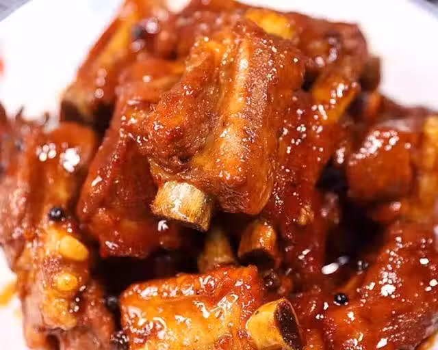 排骨500克、冰糖30克、蔥段1段、薑片4片、蒜3瓣、八角2個、花椒10來粒、生抽2勺、老抽1勺、料酒2勺、腐乳汁1勺、鹽少許