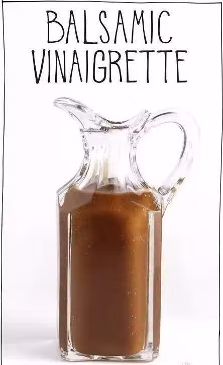 食材:橄欖油100ml、義大利香醋50ml、第戎芥末醬15ml、龍舌蘭糖漿15ml、大蒜粉少量、鹽少量、胡椒粉少量