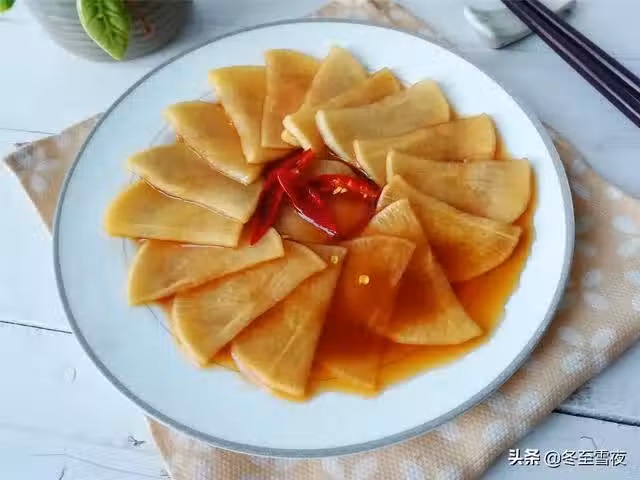 【甜酸蘿蔔】所需材料:白蘿蔔1/2個、干辣椒3個、鹽4克、白糖3湯匙、米醋1湯匙、醬油2湯匙