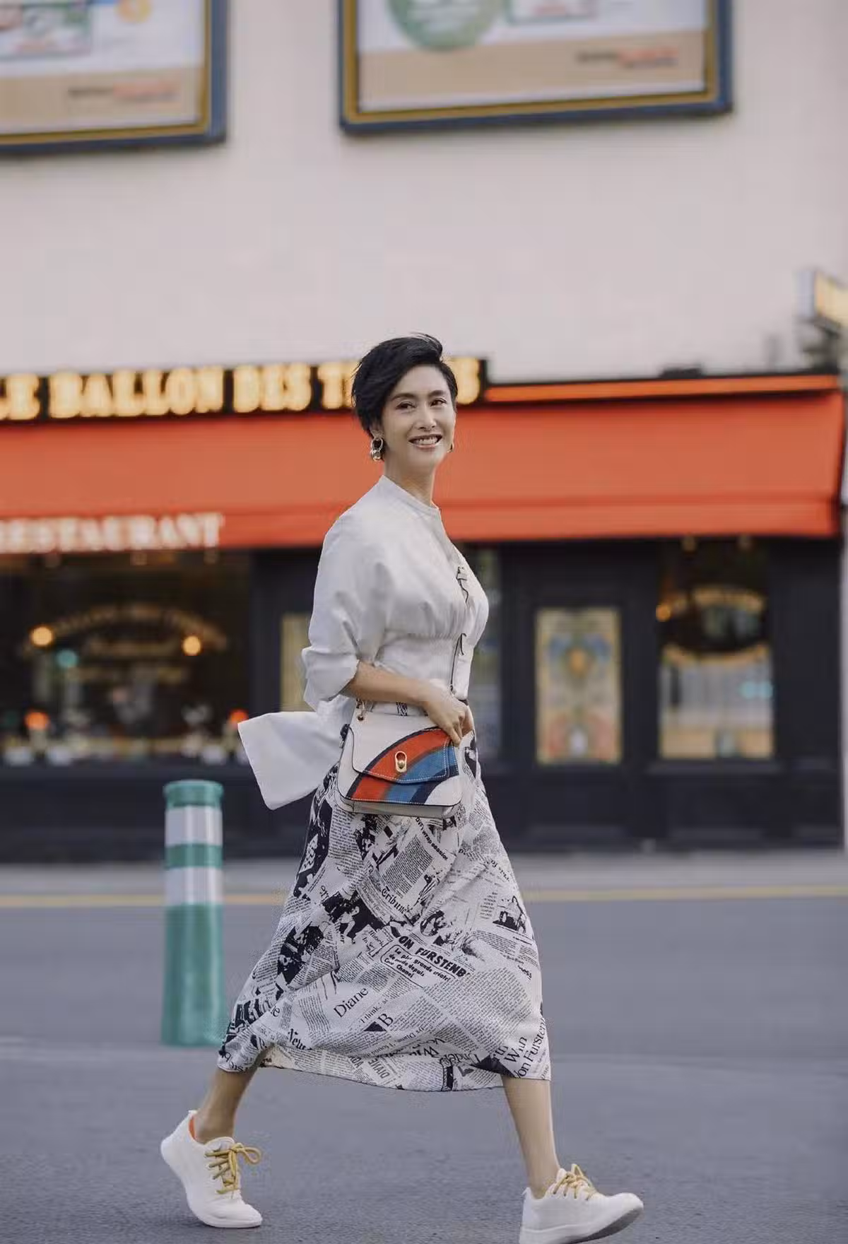 白色的上衣搭配上帶有高腰設計的印花半身裙,能夠讓朱茵的穿搭看上去更加的富有時尚感,帶有了幾分街頭潮流感,像這種印花設計會比較富有個性,選擇了簡約的黑白配色,這樣會使朱茵整體的搭配看上去更加的高級,不會讓人有眼花繚亂的感覺。