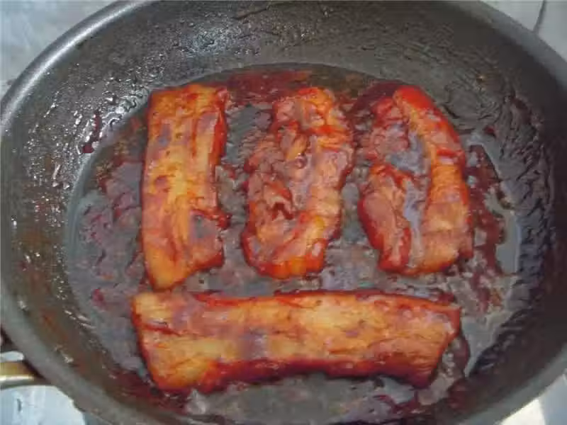 6)把制好的叉燒片回鍋小火煎至表面微帶點焦(再次逼出一些油來),口感更佳!