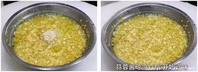 把炸過控干油的金蒜,倒入上面銀蒜盆里,然後攪拌均勻。再倒入適量剛才鍋里的蒜油,蒜油的量最少要沒過蒜末。目的是避免蒜末和空氣接觸導致氧化發黑,還能保持蒜末的鮮度和香味。