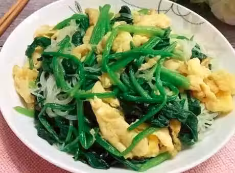 3.鍋中加點油,爆香蒜末。加菠菜粉絲同炒,加鹽、雞精、胡椒粉調味,加雞蛋翻炒均勻。