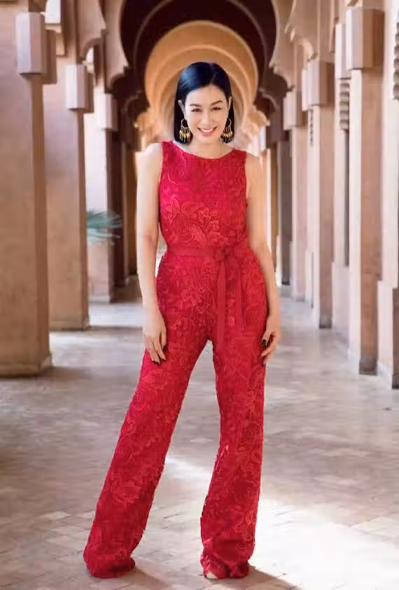 年紀較大的女性如果不擅長搭配,可以偶爾嘗試一下連體褲,這一次鐘麗緹選擇了一條紅色的連體褲,很好的詮釋出優雅的韻味,紅色的連體褲還結合了高腰的設計,能夠抬高腰線,打造出一米八的大長腿,顯高又顯瘦。