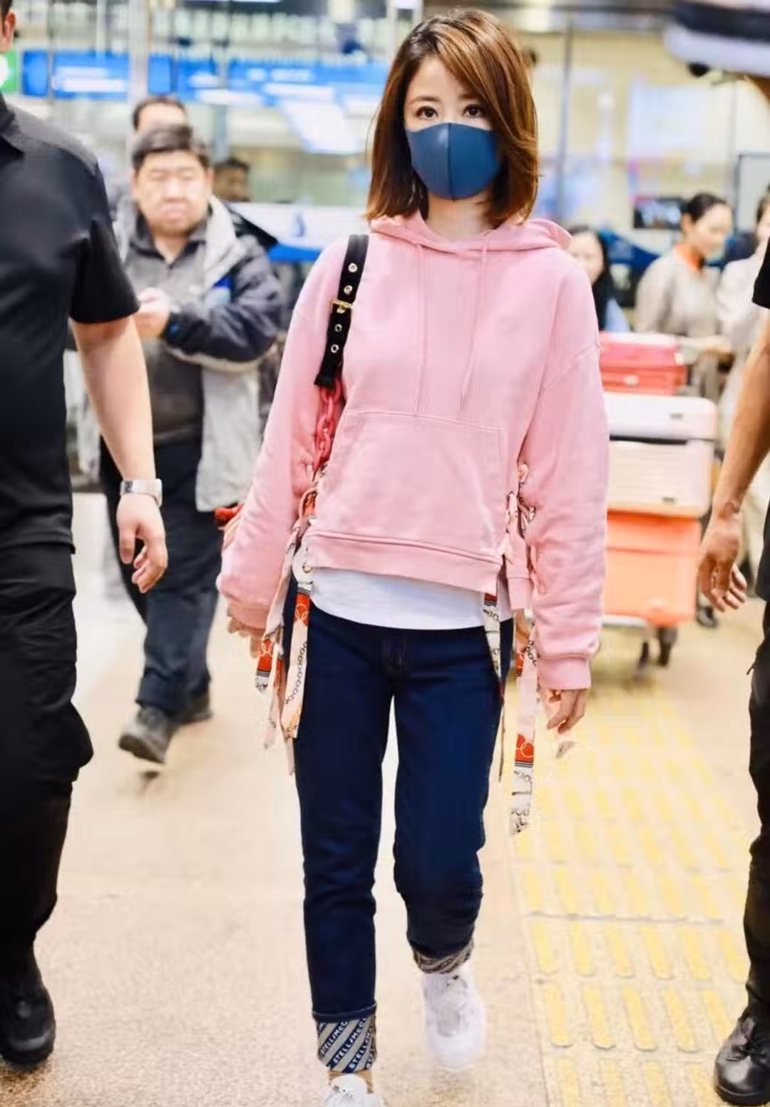 林心如獨自走機場!穿粉色衛衣配9分褲好洋氣,看不出有47歲
