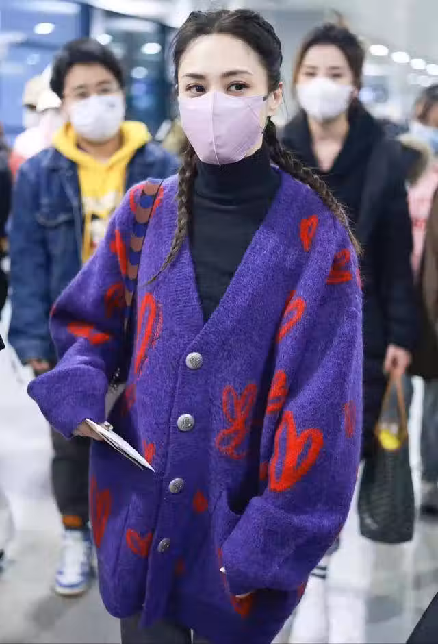 純黑色高領緊身打底衫搭配紫色針織開衫,不管是內襯還是外搭,都因為這兩類單品疊搭得到了升華。