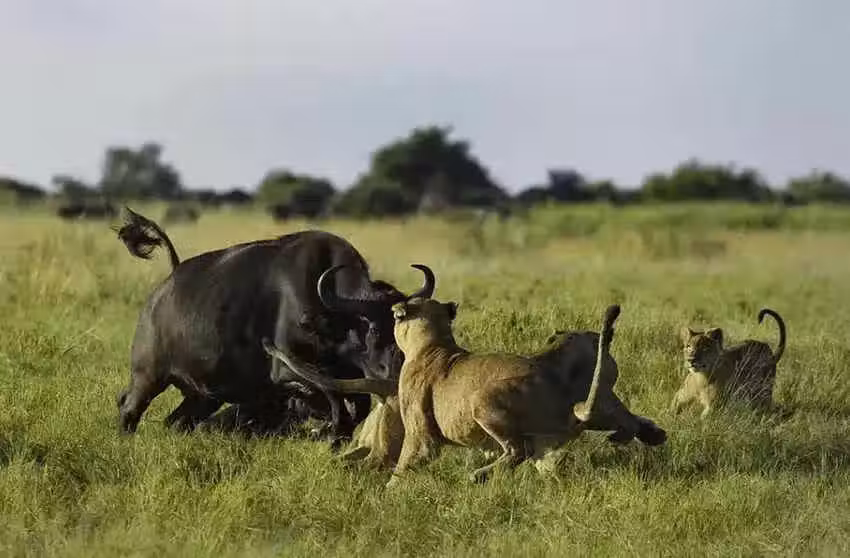 非洲野牛群是非洲草原上龐大的食草動物群體,也是一個非常強大的團隊,野牛是獅群最常見的食物也是比較危險的食物,通常在獅子或者鬣狗狩獵野牛時候,都會選擇落單或者受傷或者是幼年的野牛下手。