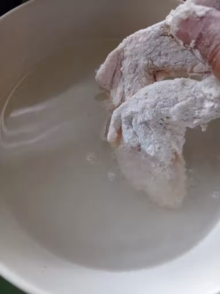 7. 準備水,把裹上粉的雞翼沾濕,然後放到麵粉裡面包裹。