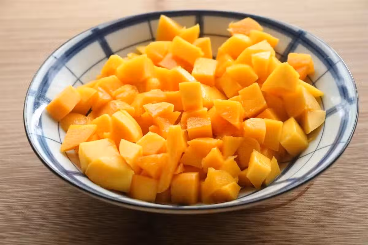 5、300克芒果丁加入50克牛奶,攪打成芒果汁;再把融化好的吉利丁片倒進去拌均勻;
