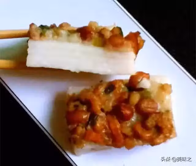 粘米粉195克、玉米粉98克、清水750克、蔥3棵、豬肉餡30克、花生米30克、干蝦仁50克、廣式臘腸1段。