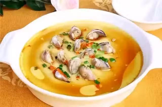 3.盤子抹油,放入煮開的白蛤,倒入過篩的蛋液。