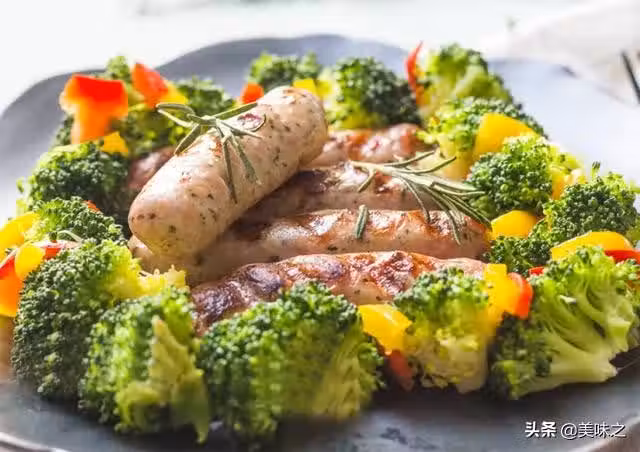 1、香腸是生的,需要提前從冰箱取出化凍,紅、黃柿子椒只需要一點點做配色,西蘭花掰開小朵,淡鹽水浸泡十分鐘左右。