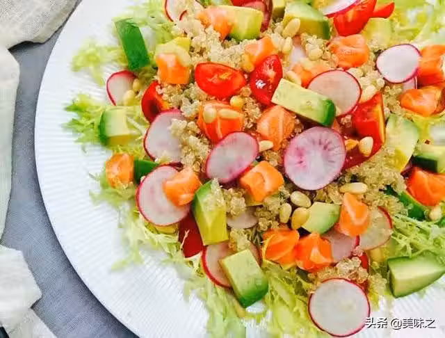 藜麥、三文魚、牛油果、聖女果、櫻桃小蘿蔔、苦菊、松子、牛油果油、胡椒鹽、檸檬。