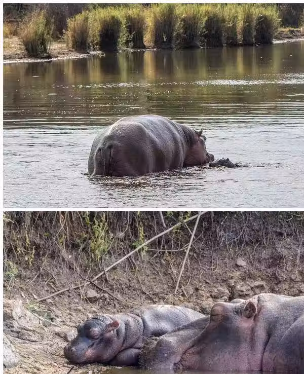 母河馬在解決掉鱷魚之後並沒有再理會。它靜靜地守候在幼崽的身邊,殷切地期待著它醒轉過來。