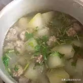 煲湯原料:冬瓜500克、五花肉250克、蔥10 克、生粉少許、鹽適量、味精適量