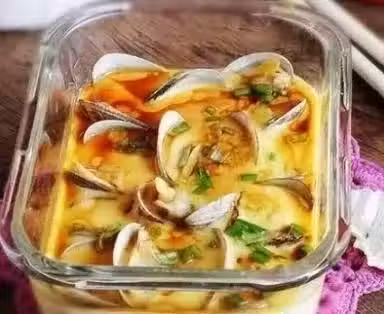 隔水蒸5分鐘後,待表面蛋熟,放入花蛤。