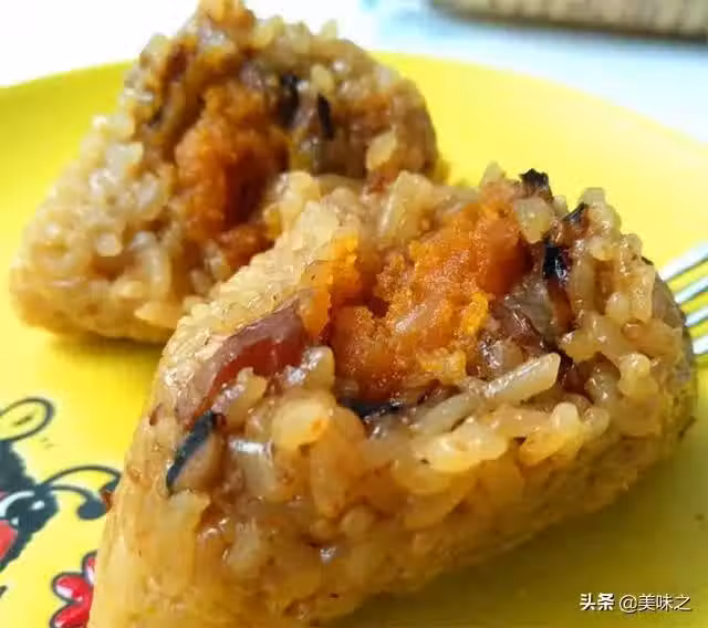 12、將粽子葉折成一個漏斗狀,放入適量糯米,再放適量滷肉,放入蛋黃,再蓋上適量糯米包好。