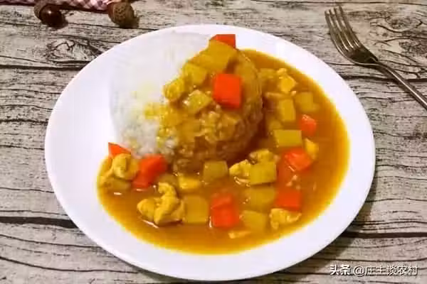 3.然後倒入土豆塊,翻炒幾下把融化的咖喱裹在土豆上;再加適量的水,大火燒開後,改小火燜煮,大概燒10分鐘這樣後,加少許鹽。