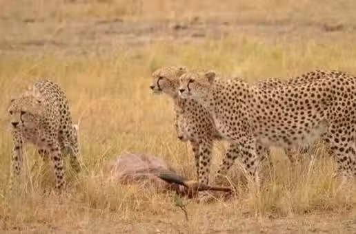 最後,聰明的它們選擇先將美味拖到安全的地方然後再準備開吃。三隻獵豹很難得的聚在一起共享晚餐,不一會兒,一隻羚羊就只剩下了骨頭。