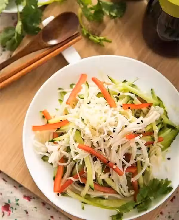 原料:金針菇、黃瓜、胡蘿蔔、生抽、醋、香油、糖