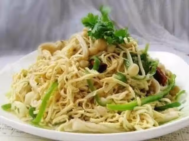 主料:金針菇150克、豆腐百葉絲5片(或豆腐乾絲) 、青椒、香菜適量