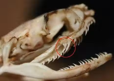 虎斑頸槽蛇並沒有上述類型的毒牙,它最後兩枚上頜齒增大,既無管也無溝,毒液只能順著毒牙流到傷口中,所以利用率並不高。