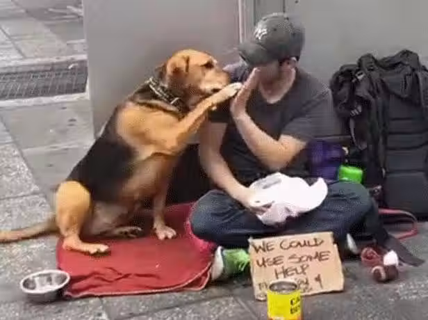 男子和狗狗在街邊乞討的時候,牠們會以擊掌的形式互相鼓勵,由此可見狗狗是多麼的懂事。