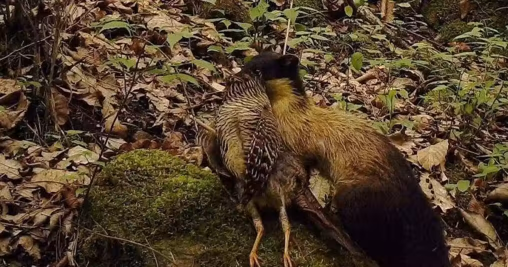 2.黃鼬搏殺野兔。黃鼬俗名黃鼠狼、黃皮子、黃大仙,是小型食肉動物。黃鼠狼還叫「黃狼」,狼毫筆的毫,其實就是黃鼠狼的毛。黃鼠狼體內有臭腺,天敵威脅到黃鼠狼時,黃鼠狼會排出臭氣麻痹敵人。黃鼠狼喜歡在清晨與黎明活動。