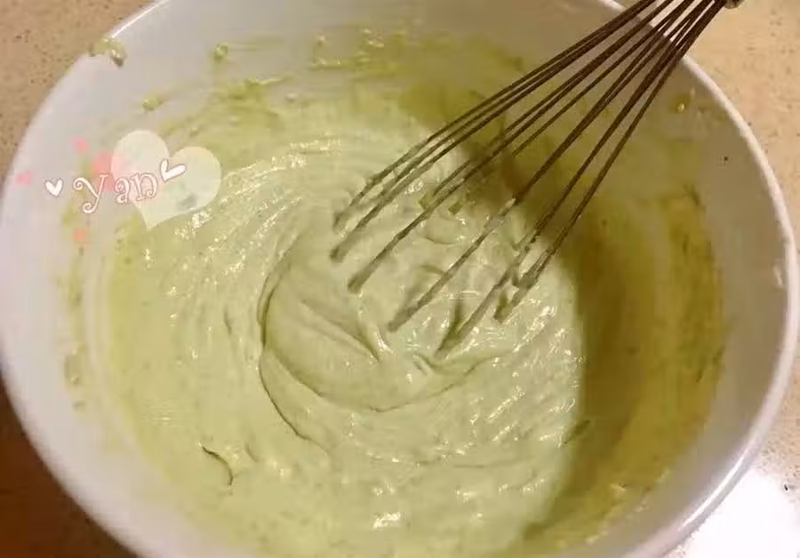 淡奶油打發至6分發,倒入已經冷卻的抹茶蛋黃牛奶糊,攪拌均勻冷藏備用