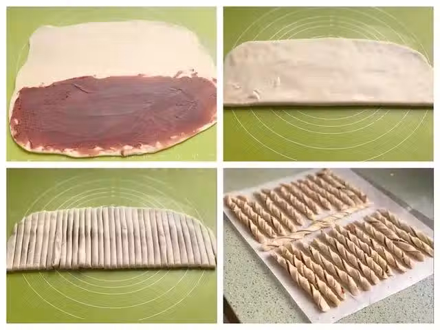 9、烤箱提前預熱10分鐘,將烤盤放入烤箱中層,上下火180度,烤10-15分鐘,這個烤制的時間是由扭扭酥的大小決定的,細一點就烤的時間短一點,粗一點的話時間就長一點。