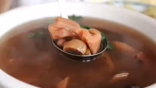 4、取一個乾淨的湯煲將準備好的蓮藕塊、栗子、花生米、香菇放入湯煲中,加入水煮開後加入少許鹽、蘑菇粉、滴入少許油、蓋上鍋蓋、調製小火,慢火煲一個小時左右,出鍋盛入湯碗中撒上少許香菜(或九層塔)即可。