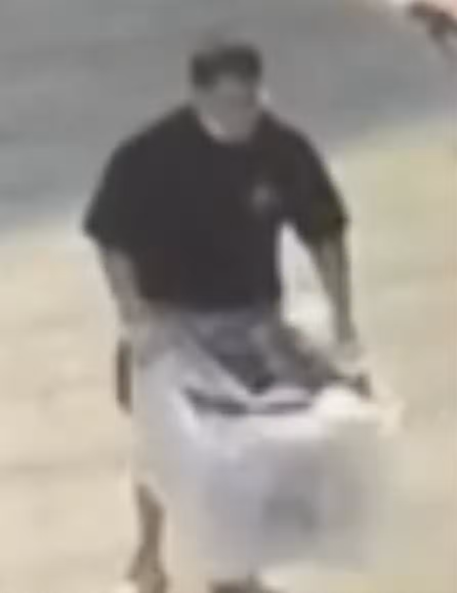 一張閉路電視截圖可見,一名疑似是男疑犯的男子手持一個塑膠箱