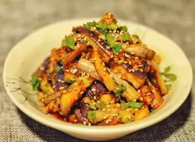 3. 茄子撕成大小合適的條放入碗中,拌勻,最後撒入熟芝麻就好了。