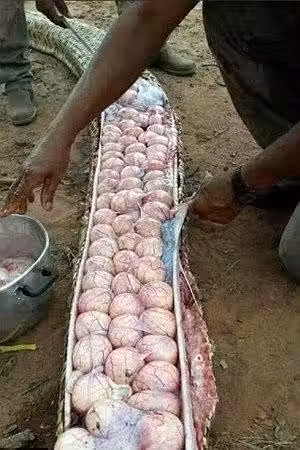 如圖所示,這條蛇並不是因為把牲口吃掉才體重超標,相反的, 其實牠是一條懷孕的蛇,雖然目前還不清楚這是什麼蛇,但許多蛇都可以一次敷上幾百顆蛋。在世界的許多地方,人們都會吃蛇蛋,當地人也認為這是一頓很補的美味大餐。