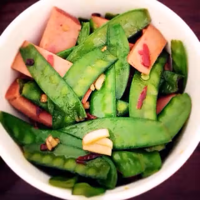 無澱粉火腿;辣椒絲;荷蘭豆;蒜;姜;蔥;生抽;五香粉