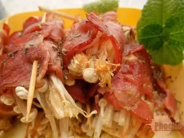 2、用半片培根裹住一小束金針菇,用牙籤固定