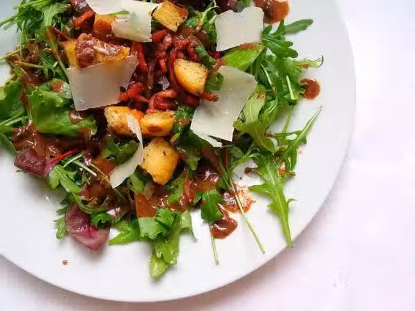 3、鍋里這時候還剩一些底油,趁著鍋子本身的餘熱迅速倒入香醋和芥末醬攪勻。按口味加鹽。鍋里的醬汁直接倒在洗凈鋪好的生菜上,撒入做法1和做法2里的麵包丁和培根丁。刨上一些乾酪片。吃的時候按自己口味添加黑胡椒即可。