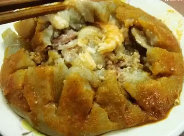 【做 法】 生粉、粘米粉、開成糊狀待用,將鱟粿印先刷油然後每個印先下半印粉糊,再下配料,後再下粉糊至滿即為止。蒸熟後從粿印中倒出,放入盛熱油盆即可。吃時在鱟粿上縱橫切幾刀,澆上適量辣椒醬