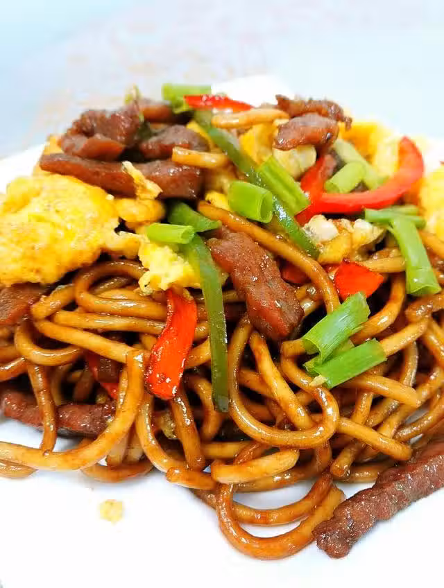 鹼水面2人份;雞蛋2個;裡脊肉適量;青椒紅椒適量;胡蘿蔔適量;胡椒粉適量;生抽50g;老抽3g;蔥適量;生粉適量;糖適量