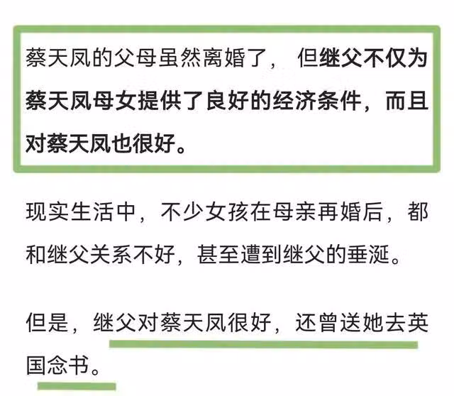 蔡天鳳沒有離世之後,她背後的家庭就挺好的,因為她的繼父對她和媽媽都特別好。