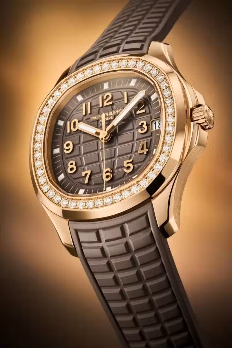此款表採用18K金玫瑰金表殼,搭配灰棕色表面和一體成型錶帶,協調一致。灰棕暖和色調,介於棕色與灰色之間,與這款腕錶「現代悠閒時尚」風格合襯無間。八角圓潤特色表環鑲以四十八顆鑽石,發放光芒。表殼防水深度達一百二十米,內藏 26-330 S C 自動上鏈機心,兼備停秒功能。