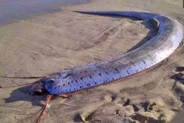 據了解,這是帶魚的一種因為體型龐大也是很多海洋傳說中的怪物,它還有很多的別稱「大帶魚 百牛 豬精 龍王魚」等等。。。這種魚生活在300到1000公尺深的海里,性情兇猛,會捕食一切生物!這種魚一般情況下也不會出現在海面上!至於這條被沖上岸的倒霉傢伙就不知道是什麼原因了!