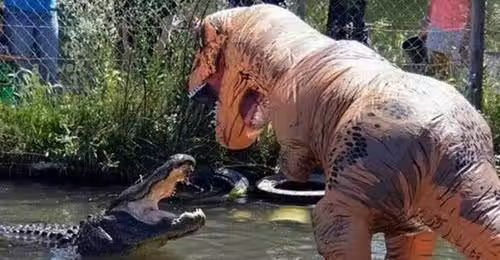 老外穿上恐龍服裝,襲擊水池中的鱷魚,「鱷魚的行為」把人看懵了