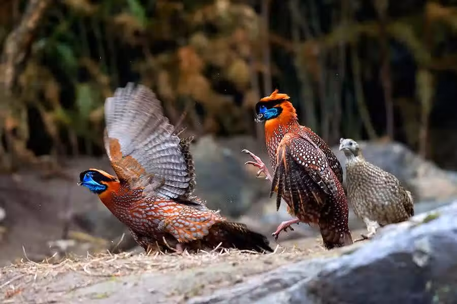 外表美麗,路子很野的紅腹角雉,其實內心也很張揚,尤其是在求偶的時候。據科研人員觀察,紅腹角雉一般是在4月進入繁殖期。雄鳥在遇到喜歡的對象時,肉裙,也即「水囊」不僅顏色會更加鮮艷,而且還會膨脹。