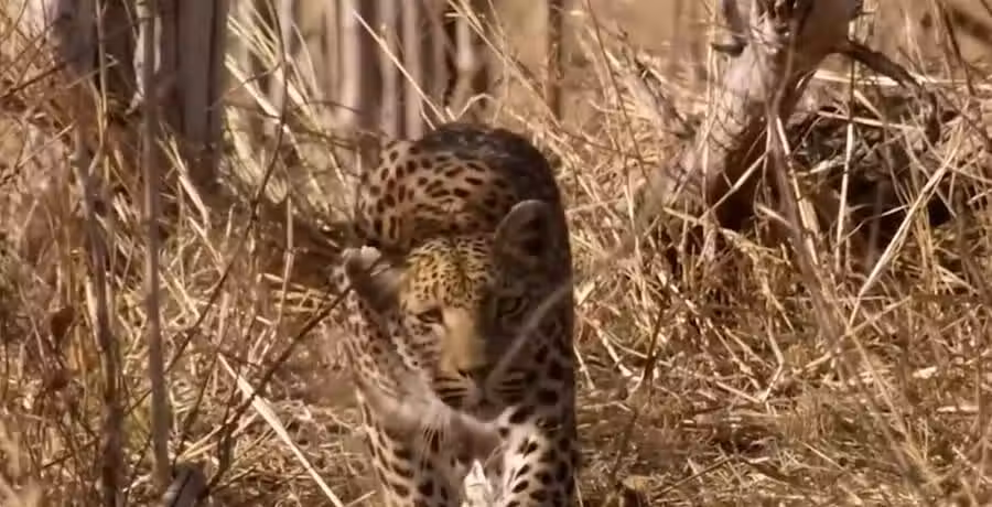 花豹偷偷獵殺一隻小狒狒,干凈利落不拖泥帶水,得手後被狒狒群圍攻